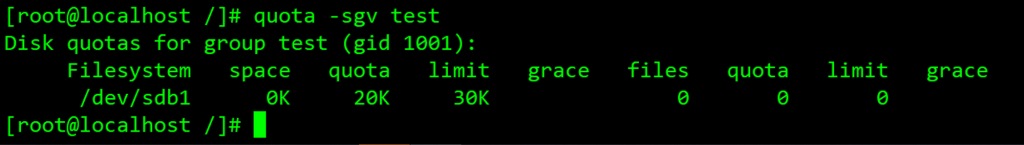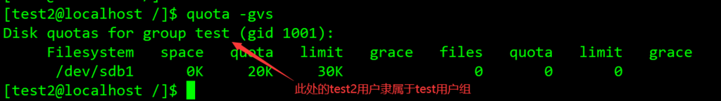以上操作全部完成后,我们的磁盘配额操作即完成,我们可以使用quota指令来查看用户或者用户组的磁盘配额占用情况:
