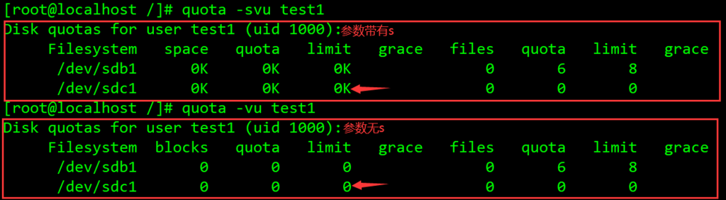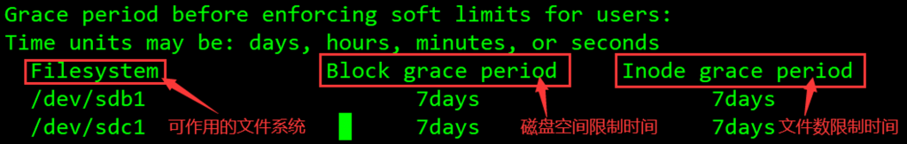 - blocks:显示该用户/用户组在该文件系统下已经占用的磁盘资源(单位默认为Kb)此处并非是给用户更改的参数!!