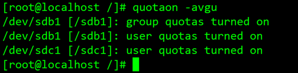 结束了对目标用户/用户组的配额限制之后,我们可以启用quota了,使用**quotaon**指令,我们即可启用quota系统