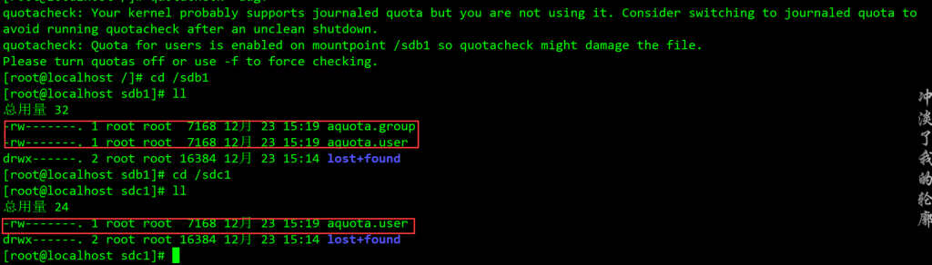 拥有以上任意一个参数,即代表该文件系统支持quota磁盘配额,我们只需检查磁盘有无支持quota,不支持将其添加quota标识,将其重新挂载。检查完毕后,我们使用quotacheck指令来扫描磁盘,以获得aquota.user配额文件和aquota.group配额文件。
