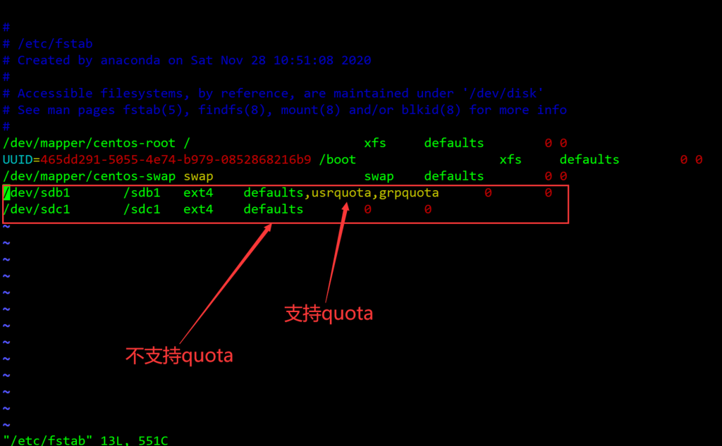如上,我们看见在fstab文件中的options列上,sdb1拥有了两个参数:usrquota和grpquota,很明显,这两个参数正是文件系统支持quota的证明: