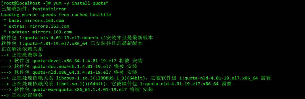 检查机器有无安装quota文件,若无安装,使用yum -y install quota指令安装即可: